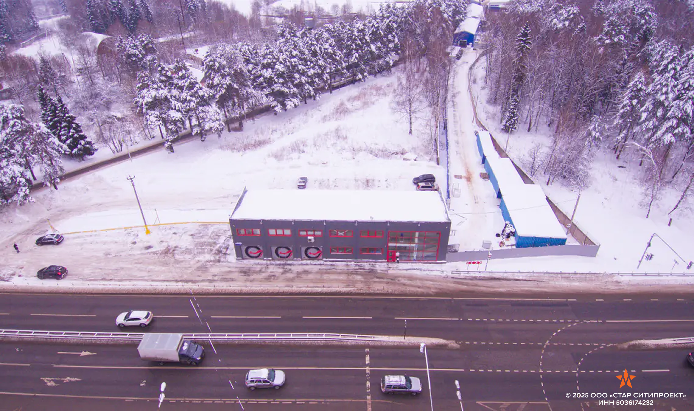 Быстровозводимое двухэтажное здание шиномонтажа из металлических конструкций с наружными ограждающими стенами из сэндвич-панелей.