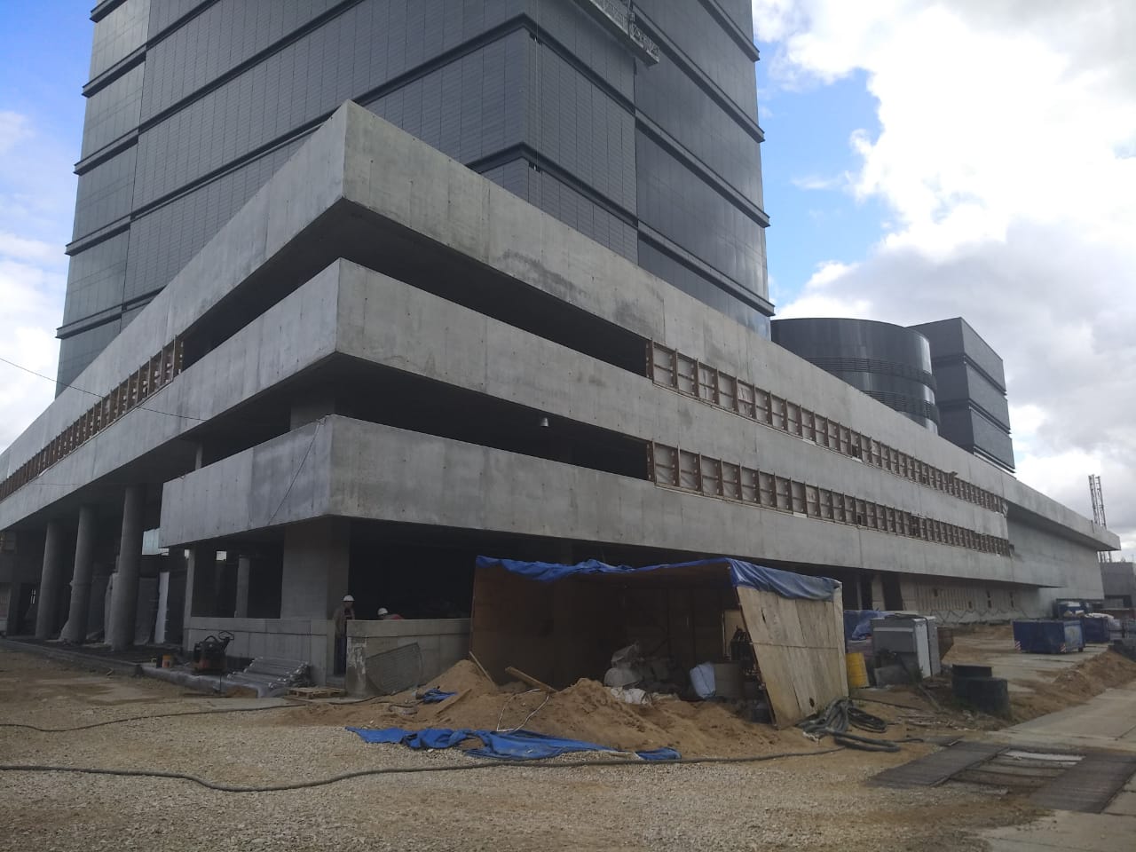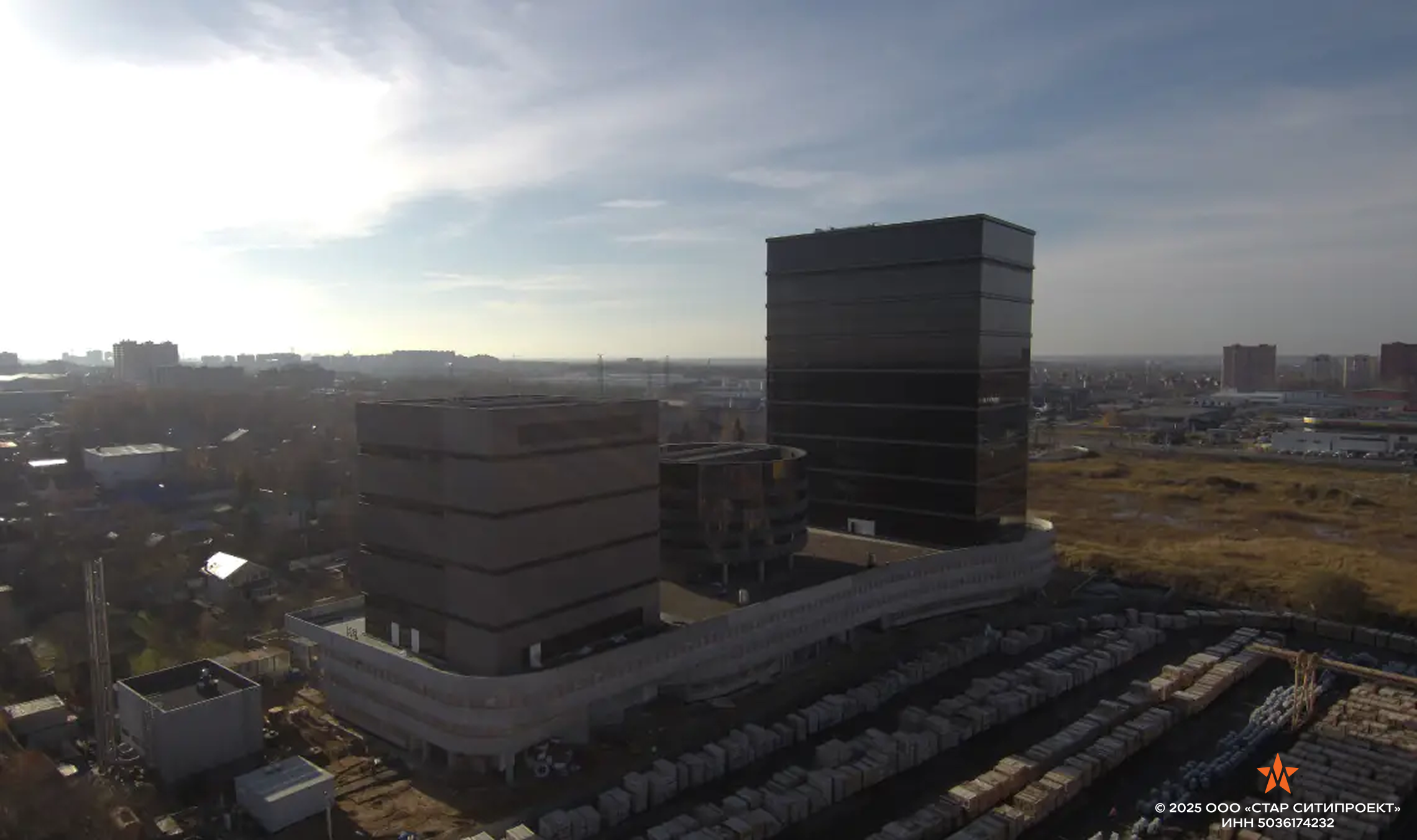 Офисно-складской комплекс из 3-х основных разно этажных корпусов, объединенных трехэтажным стилобатом с открытыми автостоянками. Комплекс включает в себя: