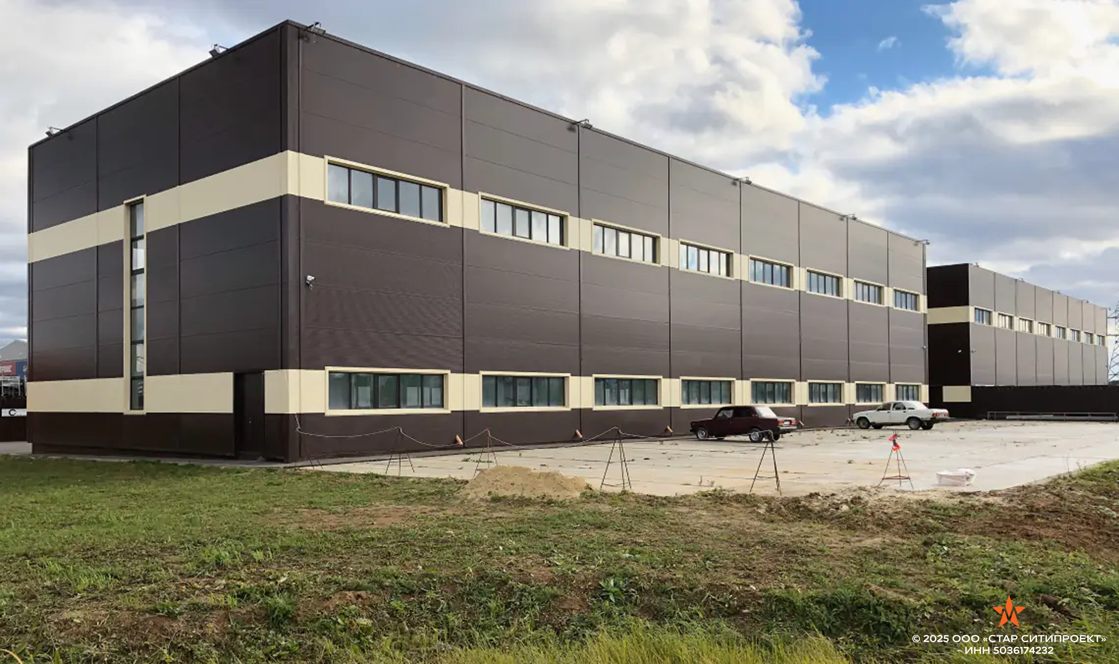 Многофункциональное монолитное здание с наружными ограждающими конструкциями из сэндвич-панелей.